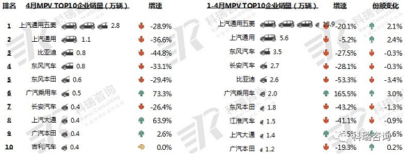 4月,TOP10 MPV企业销量三升六降一平;上汽通用五菱依旧位居榜首,但销量下滑较大,达28.9%;广汽乘用车增长最大,达73.3%;