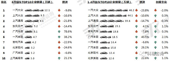 4月,乘用车市场销售量有所下滑,连续10个月处于负增长状态。