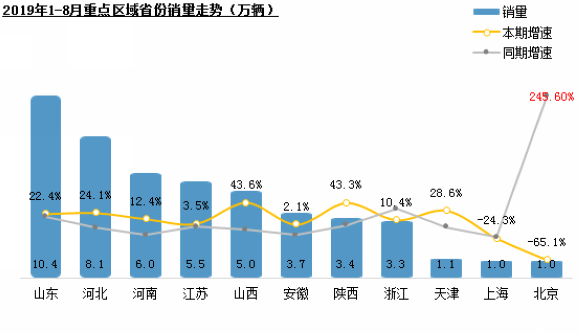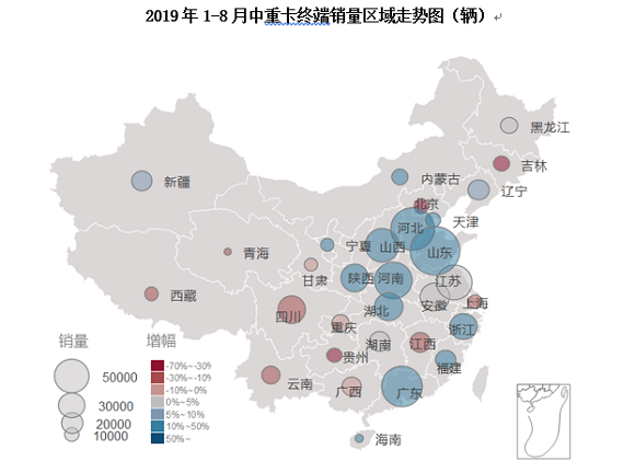 2019年1-8月,“非重点区域”主销省份中重卡销量表现平平,其中广东因一直走在环保治理的前列、内蒙古采取对标“重点区域”环保治理的举措,市场表现相对较好。