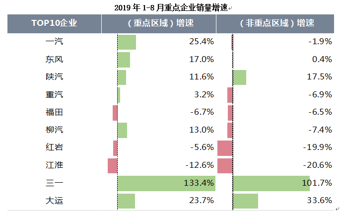 分企业来看,2019年1-8月中重卡重点企业在“重点区域”的整体表现明显好于“非重点区域”,一汽、东风、重汽等主销企业在“重点区域”增速明显快于“非重点区域”。