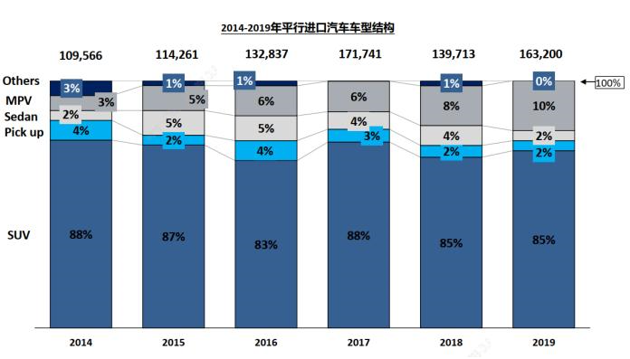 在整体进口汽车市场当中,平行进口汽车为16.32万辆,同比增长了16.8%。值得注意的是,平行进口量占进口总量的15%,较2018年同期水平增长了2.4%。此外,平行进口车市场以SUV为主体,整体进口份额达到85%。