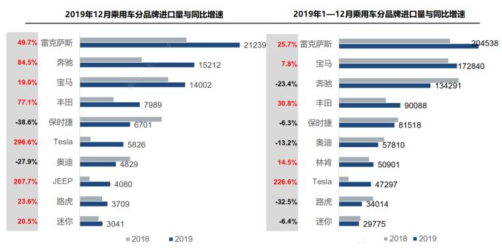 分品牌方面,2019年进口量前十的品牌有一半呈现增长状态, 其中特斯拉实现了同比226.6%的增长、丰田同比增长30.8% 、雷克萨斯同比增长25.7% ,是其中增速最快的三个品牌;下滑品牌当中,路虎同比下降32.5%、奔驰同比下滑23.4%、奥迪同比下滑13.2%。