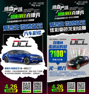 在4月26日雅森严选优质项目直播秀中,爱普生微喷车艺推出了炫彩变色龙彩绘膜,以独家具有的靓,炫,酷特点,帮助采购商打造差异化卖点。