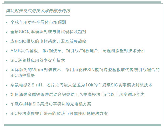 由于以SiC为代表的新一代功率半导体对于电动化动力系统采用高电压、提升效率和功率密度具有重要作用,功率半导体企业、整车、电驱动和电控企业争先入局新一代功率半导体模块领域。但目前多数企业在沿用硅基IGBT模块的封装和测试技术,难以实现SiC MOSFET优越的性能,迫切需要在模块设计、连接与封装材料、工艺、制造设备及测试验证等方面加快技术创新,提高额定结温、散热效能、可靠性,降低杂散电感参数,以及优化成本结构。