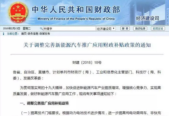 今年2月13日,财政部官方网站公布了《关于调整完善新能源汽车推广应用财政补贴政策的通知》(财建〔2018〕18号)。新政规定,6月11日前执行老的补贴政策,6月12日开始执行新的补贴政策。新政最大的特点是,大幅提升电池能量密度标准,推动高续航乘用车增长,推动专用车规范升级,实现高质量增长。