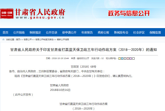 2018年10月19日,为持续实施大气污染防治行动,甘肃省政府办公厅印发《甘肃省打赢蓝天保卫战三年行动作战方案(2018—2020年)》的通知,提出通过采取十大类43条具体措施,努力在三年时间中坚决打赢蓝天保卫战。