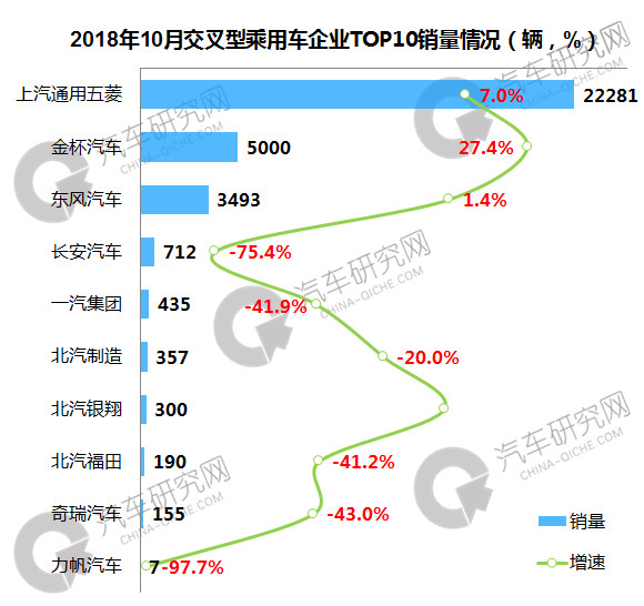 1-10月,交叉型乘用车企业中,上汽通用五菱位居第一,累计销量达到250901辆,但增速同比下滑15.7%,金杯汽车累计销量位居第二,前十企业中,奇瑞汽车增幅最大,累计增幅为141.2%。