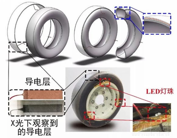 由于轮胎在工作过程中的运动状态和上文提到的四种基本模式都不相同,因此在发电轮胎中的摩擦纳米发电机需要结合轮胎的实际工作状况单独设计的。我们将导电层置于胎面层中间,使用轮胎胎面作为摩擦纳米发电机的摩擦层,将导电层内置于其中,这样在轮胎成型的步骤中可以使用和普通轮胎相同的工艺流程。发电轮胎的结构如图3所示。