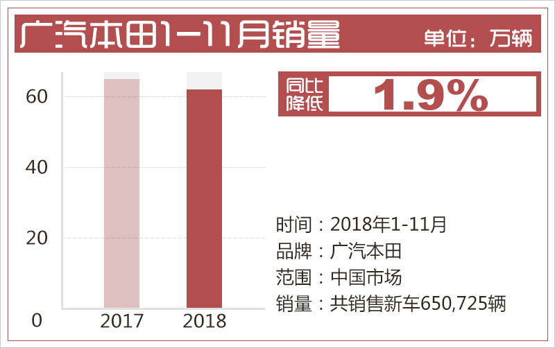 进入2018年年末,车市遭遇冷流,广汽本田没能坚持上半年势头,销量有所下滑。网通社从本田中国官方获悉,广汽本田汽车有限公司2018年1-11月终端累计销量为650,725辆,同比降低1.9%;11月份终端销量为67,735辆,同比降低7.8%。