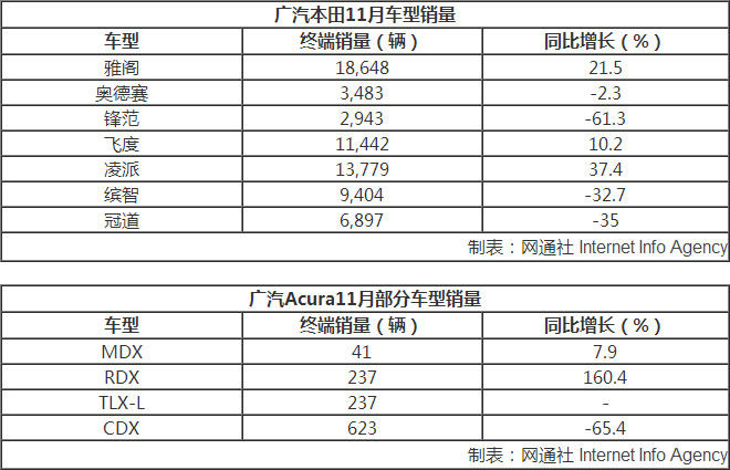 在具体产品表现上,雅阁11月份达到销量18,648辆的成绩,同比增长21.5%;飞度11月销量为11,442辆,同比增长10.2%;凌派11月销量达到13,779辆,同比增长37.4%。全新RDX于11月初正式上市,为讴歌注入动力,11月单月销量达到237辆,同比劲增160.4%。