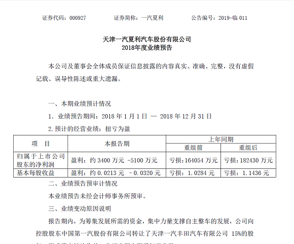 一汽夏利2018年度预计净利润约3400万元 -5100万元 实