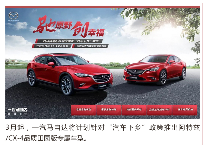 此外,3月起,一汽马自达将计划针对“汽车下乡”政策推出阿特兹/CX-4品质田园版专属车型。据悉,该车型将根据农村用户的实际需求进行升级,并提供低首付租赁产品等政策。