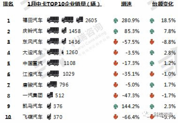 1月,TOP10中卡企业销量五升四降一平。福田汽车销售2605辆,销量和市场份额均大幅增长。庆铃汽车、东风汽车、大运汽车、中国重汽和江淮汽车销量过千,东风汽车和飞碟汽车降幅超过50%。