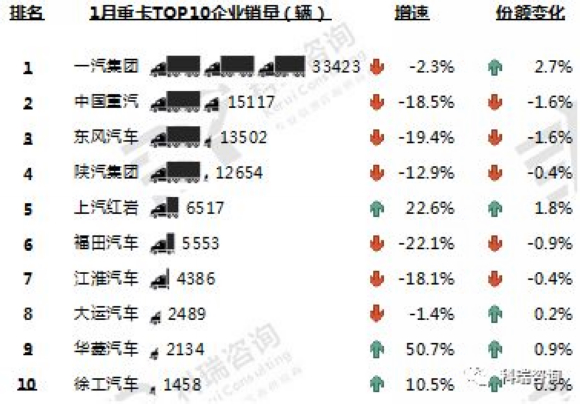 1月,TOP10重卡企业销量三升七降。一汽集团销售3.3万辆,稳居榜首,同比下滑2.3%,市场份额增长2.7个百分点。中国重汽、东风汽车和陕汽集团位列2-4位,销量同比下滑。华菱汽车增幅较大,同比增长50.7%。