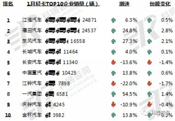 1月,TOP10轻卡企业销量七升三降。江淮和福田位居前两位,销量接近2.5万辆,东风汽车、长城汽车、长安汽车和中国重汽销量均超过1万。一汽集团增幅较大,同比增长54.5%,江铃汽车降幅较大。