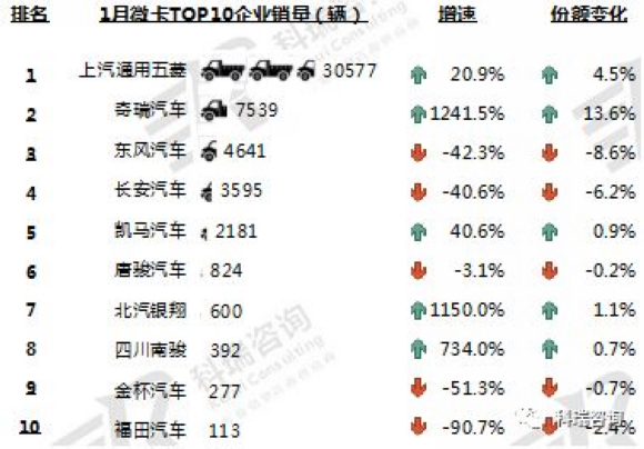 1月,TOP10微卡企业销量五升五降。上汽通用五菱销售3.1万辆遥遥领先,同比增长20.9%。奇瑞汽车和北汽银翔销量暴增,增幅均超过1000%,前者市场份额增长13.6个百分点。东风汽车、长安汽车、金杯汽车和福田汽车销量大幅下滑。