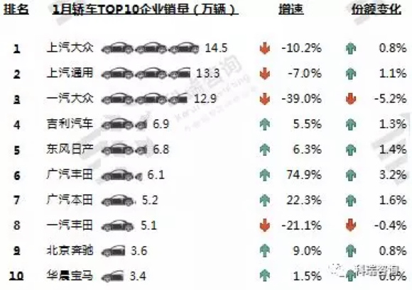 1月,TOP10轿车企业销量六升四降。上汽大众、上汽通用和一汽大众位居前三,销量均超过10万辆。广汽丰田和广汽本田销量增幅较大,一汽大众、一汽丰田销量和市场份额均下滑。