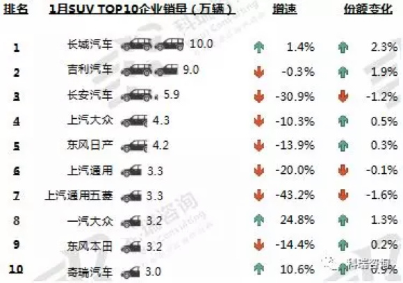 1月,SUV销售87.9万辆,同比下滑18.9%。
