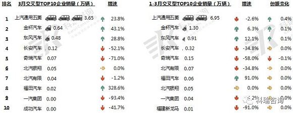 3月,TOP10交叉型企业销量四升五降一平。交叉型销量普遍较少,仅上汽通用五菱销售超过1万辆,福田汽车因同期基数小增幅较大,同比增长328.6%。1-3月,TOP10交叉型企业销量三升六降一平。上汽通用五菱销售6.95万辆,稳居首位,其他企业仅金杯汽车销量过万,市场份额总体维持不变。