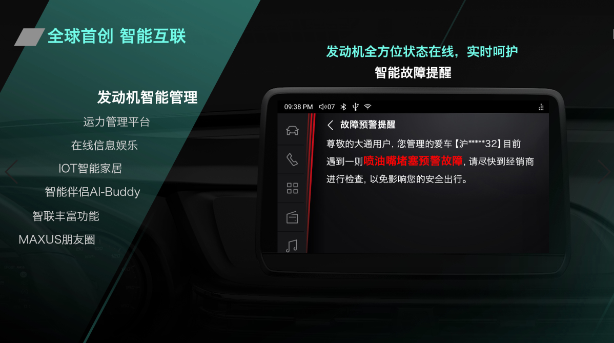 上汽大通MAXUS V90是细分市场内唯一搭载最新一代智能网联系统——蜘蛛智联的车型,并首创开发“发动机智能”在线服务,可实现关键零件预诊断、发出故障预警、提供检修方法、快速锁定问题等多项功能。此外,该系统还具备环境感知功能,可根据环境变化推送提示,给予无微不至的呵护。