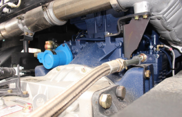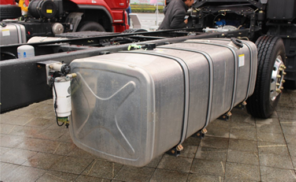 车架右侧装配800升铝合金油箱,按照满载车货总重31吨,平均百公里油耗28升计算,这个油箱加满能够保证2800多公里的续航里程。