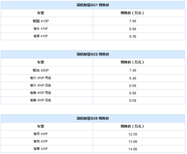 日前,国机智骏宣布旗下国机智骏GC1、国机智骏GC2、国机智骏GX5三款产品开启预售,其中国机智骏GC1的预售价区间为7.88-9.38万元;国机智骏GC2的预售价区间为7.48-9.08万元;国机智骏GX5的预售价为12.58-14.98万元。详细预售价请见下表: