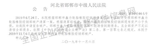 近日,河北省邯郸市中级人民法院裁定,宣告邯郸市鑫力轮胎橡胶经销部正式破产。