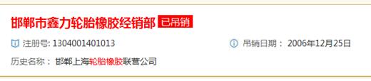 资料显示,这家轮胎经销商成立于1992年,曾用名为邯郸上海轮胎橡胶联营公司,目前,其营业执照已被吊销。