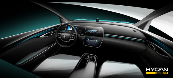 从此次曝光的设计图来看,新车的内饰设计颇为简洁,几乎看不到实体按键,银/碧青双色饰条贯穿整个中控台区域。中间采用不对称设计的三联屏十分瞩目,把仪表盘+中控屏+空调控制区域都采用液晶屏设计,并连接在一起。多功能方向盘采用双辐设计,配色采用银黑双色布局,中央扶手箱处还保留了实体旋钮。座椅造型则颇为运动,采用一体式设计,副驾位置也支持多向座椅调节,其头枕位置还镶有品牌英文“HYCAN”的LOGO。