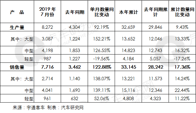 8月2日,郑州宇通客车股份有限公司发布2019年7月产销数据快报。数据显示,7月份,宇通销售各类客车7716辆,环比增长69.58%,同比增长122.88%;生产各类客车8272辆,环比增长89.42%,同比增长92.19%。2019年1-7月份,宇通累计销售各类客车33145辆,同比增长17.36%;累计生产各类客车32659辆,同比增长9.43%。