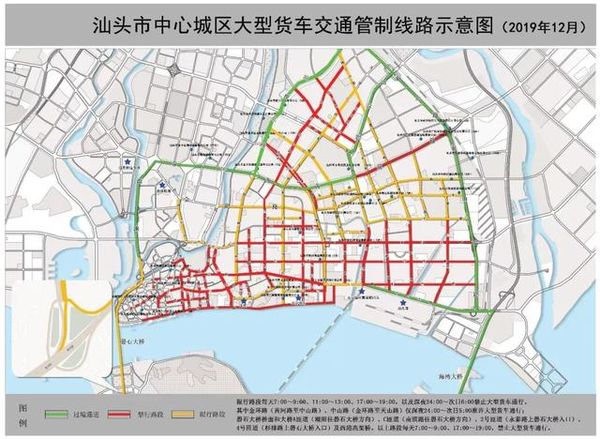 四、设定以下路段为中心城区(北区)大型货车限制通行的路段:滨港路(龙眼路口~东厦路口)、红领巾路、金砂西路、杏花桥、杏花路、珠池路、榕江路、珠江路、金湖路(护堤路口~东厦路口)、练江路、长江路、兴业路、天山路(珠池路口~黄河路口);