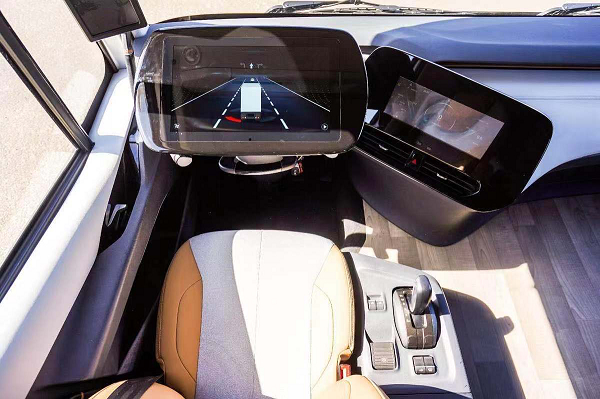 从驾驶室内部看,两侧A柱上配有长方形的显示屏,能够实时显示车辆两侧流媒体后视镜采集的路况信息,安全大有保障;中控台则设计了两块超大尺寸的显示屏,与方向盘相接,在自动驾驶时能够为司机提供娱乐影音等服务,可谓贴心备至。