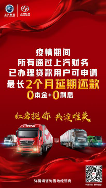 疫情当前,离不开卡车司机的一次次支援。上汽红岩感谢所有为抗击疫情做出贡献的卡友,疫情期间,凡是已经通过上汽财务办理购车贷款的用户,最长可申请1个月的0本金+0利息延期还款。值得一提的是,针对在湖北省通过上汽财务办理购车贷款的用户,更可申请最长2个月的0本金+0利息延期还款。详情可咨询当地经销商。