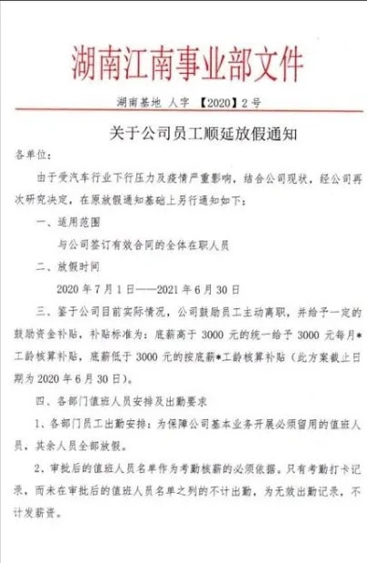文件显示,众泰湖南基地研究决定在原放假通知基础上再次顺延放假,涉及与公司签订有效合同的全体在职人员,放假时间直至2021年6月30日。众泰方面称,此举是由于受汽车行业下行压力及疫情严重影响,并结合公司现状作出的决定。