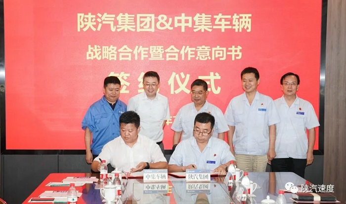 中集车辆投资管理部总监叶茁与陕汽控股党委委员、陕汽集团副总经理刘水库代表双方签署战略合作意向书。