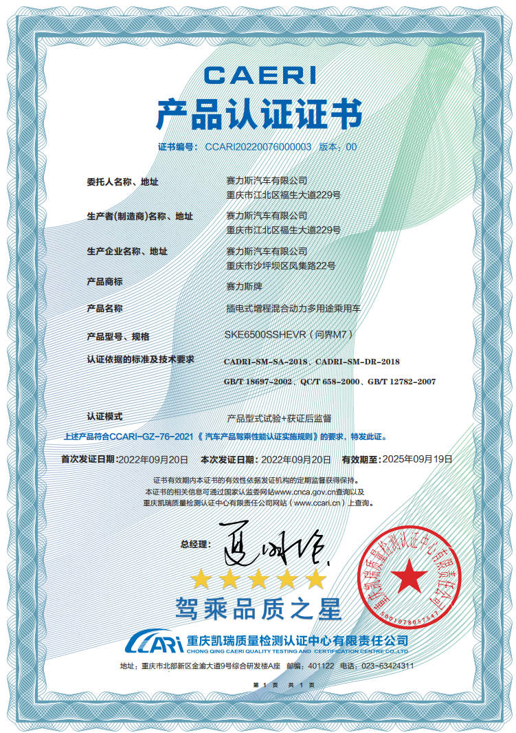 近日,中国汽研对AITO问界M7完成了汽车产品驾乘性能认证。凭借出色产品力,问界M7通过了操控、制动、加速、静谧、感温多个维度的严苛评测。这是继问界M5之后,问界系列车型再次获得中国汽研五星“驾乘品质之星”认证。