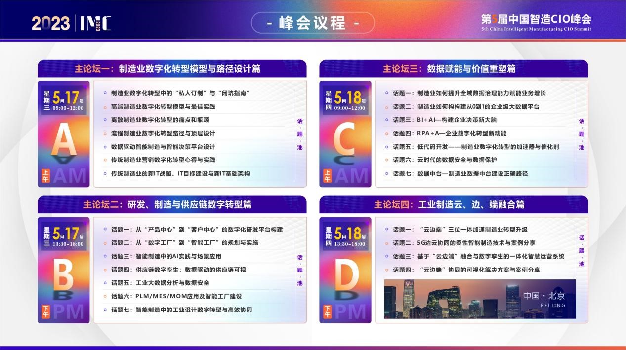 2023第五届中国智造CIO峰会将于北京隆重举行!本次峰会以“数字科技赋能,加速智造向前”为主题,现场汇集350+智能制造行业知名企业高管、CIO、