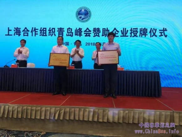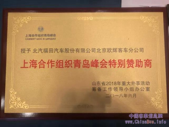 6月25日,上海合作组织青岛峰会社会赞助授牌仪式在青岛国际会议中心举行,49家企业获得授牌表彰,其中福田欧辉被现场授予为“特别赞助商”。