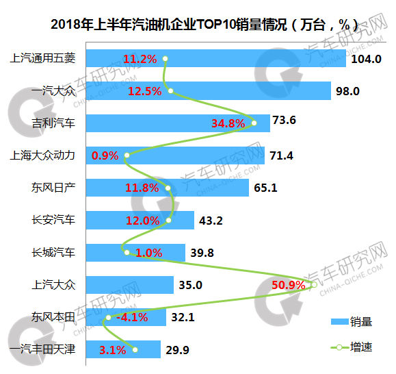 上半年汽油机企业中,上汽通用五菱位居第一,销量超过100万台,同比增长11.2%;一汽大众位居第二,累计销量达到98万台,同比增长12.5%;前十企业中,上汽大众动力增幅最高,同比增长50.9%。