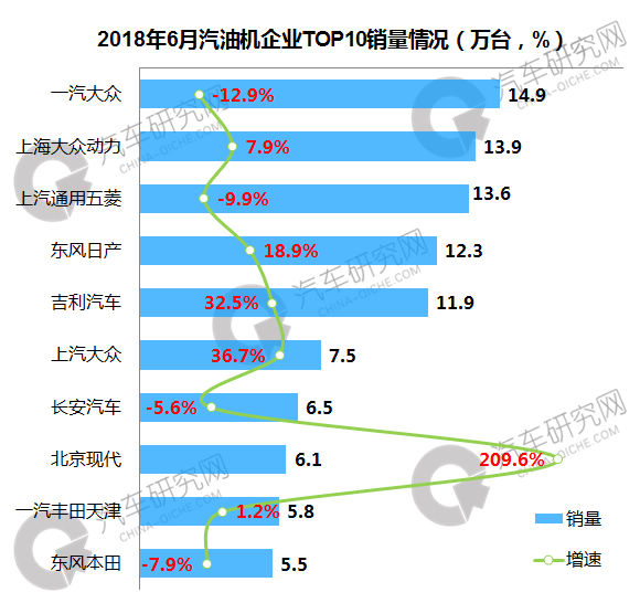 6月份汽油机企业中,一汽大众位居第一,销量达到14.9万台,同比下滑12.9%;上海大众动力位居次席,销量达到13.9万台,同比增长7.9%;前十企业中,北京现代增幅最高,达到209.6%。