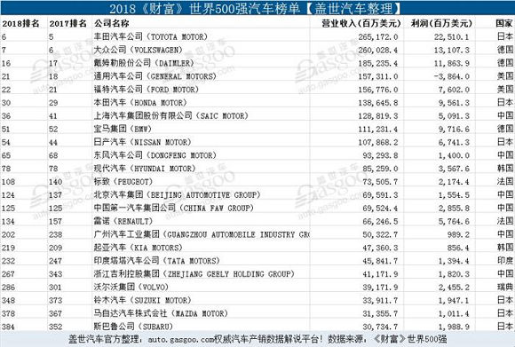 在2018《财富》世界500强榜单上,共有23家整车集团上榜。虽然丰田汽车仍居全球整车集团首位,但是总榜单名次较去年相比下滑一名。大众汽车紧跟其后,总榜单名次也下滑一名。