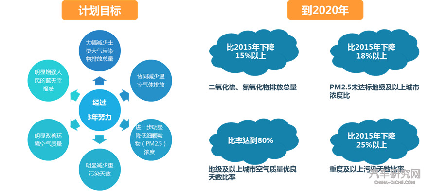 蓝天保卫战要求到2020年,SO2、NOx排放总量较2015年下降15%以上;PM2.5未达标地级及以上城市浓度下降18%以上,地级及以上城市空气质量优良天数比率达80%,重度及以上污染天数比率下降25%以上;北京要在“十三五”目标基础上进一步提高。