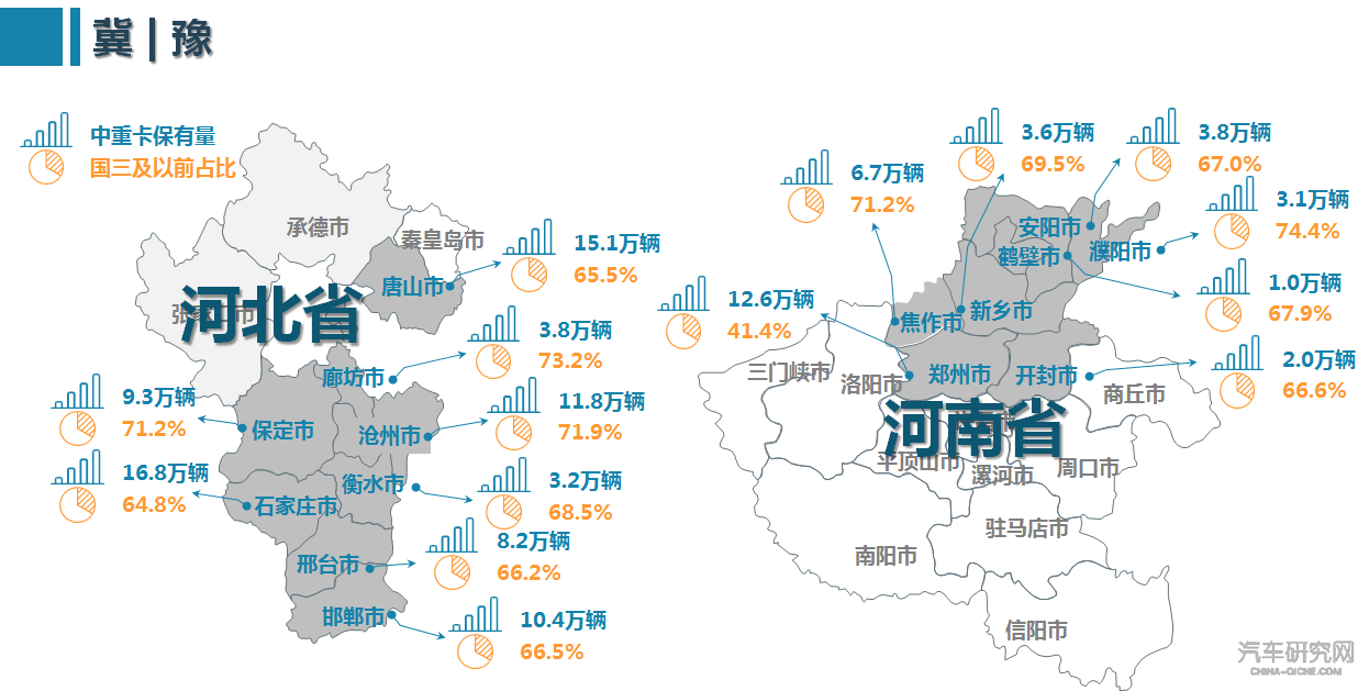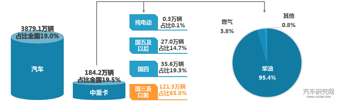 城市中重卡保有量约为184.2万辆,占全国比重的19.5%,其中国三及国三前车辆占比约为65.8%,95.4%为柴油车。