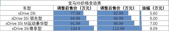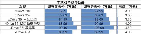 2018年7月30日起,宝马公司提高了宝马X5和宝马X6这两款美产车系的全系售价,涨幅在3.00-8.09万元之间,其中部分泰国生产的宝马X5车型与美国生产车型保持同步调整,宝马X4车型定价暂时没有变化。这一举措显然是为了应对对美整车进口关税上调而导致的成本上涨。北京时间7月6日12:01起,中国对美国产进口汽车的关税税率从15%上涨至40%,相比之下,此次宝马X5/X6的官方建议零售价只上调了4%至7%。