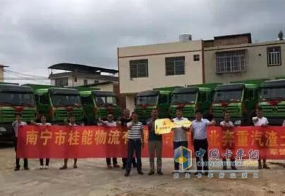 2016年9月21日,北奔重汽经销商广西军楚旭汽贸首批10台北奔智能渣土车顺利交付广西桂能物流公司,参加本次交车仪式的有北奔华南大区经理范聪辉、北奔广西分公司经理郭俊峰、驻马店中集华骏广西负责人段峰、军楚旭汽贸总经理农春光、桂能物流总经理潘裕新及北奔广西中心服务站军之汇总经理吴军等。
