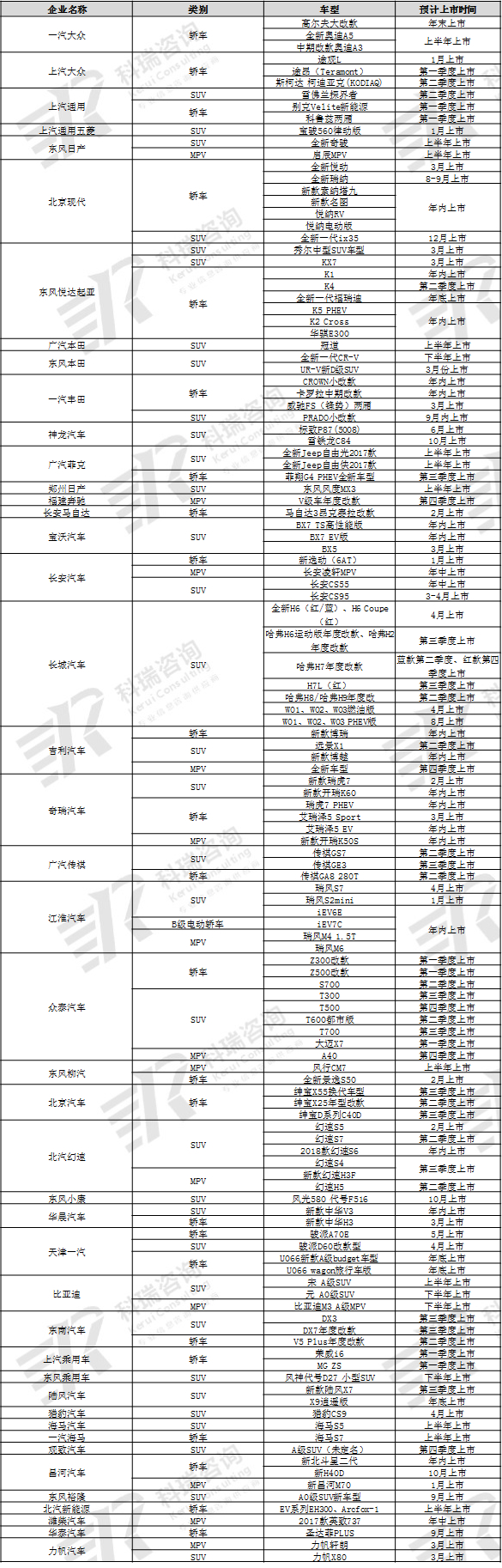 二、2017年主流乘用车企业新车规划汇总