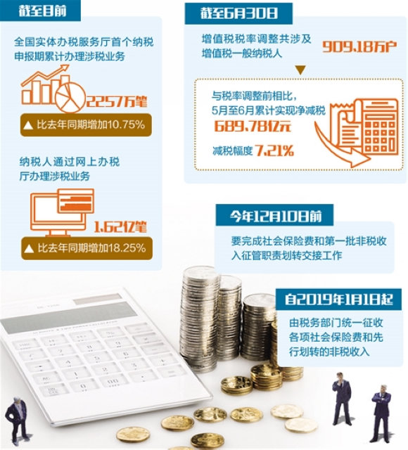 今年3月28日,国务院常务会议推出了深化增值税改革的三项重大改革举措,从2018年5月1日起实施。税务总局货物和劳务税司司长王道树介绍,“截至6月30日,增值税税率调整共涉及增值税一般纳税人909.18万户,与税率调整前相比,5月份至6月份累计实现净减税689.78亿元,减税幅度7.21%”。