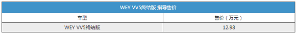 12月10日,WEY VV5终结版正式上市,售价为12.98万元。新车整体外观与现款WEY VV5基本相同,仅是在细节和配置方面进行调整。详见下表: