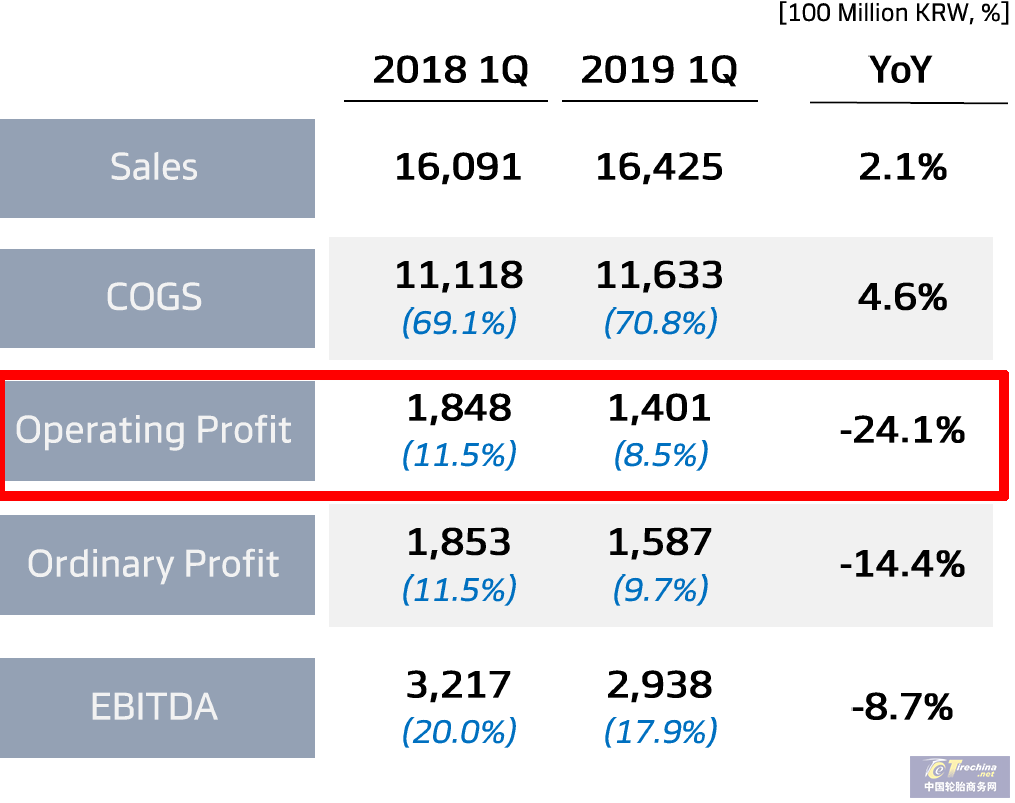 2019年5月3日,韩国首尔 - 韩泰轮胎有限公司刚刚发布了其2019年第一季度运营成绩,数据显示第一季度的全球销售额增长2.1%,营业利润却下降24.2%。不过韩泰没有详细说明利润收益下降的原因,营业利润数据定格在1.245亿美元。尽管从2018年开始的全球汽车行业放缓已经蔓延到了2019年,不过韩泰的销售收入逆势增加至14.6亿美元,营业利率下降3个百分点至8.5%。