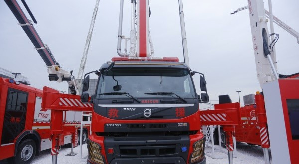 中国卡车网记者现场了解到,48米大跨度举高喷射消防车是由三一重工自主研制、全球首创国六排放标准消防车,采用沃尔沃底盘,拥有大跨度全折叠臂架,能实现360度精准灭火,有效破解了市中心、老城区,大型商超等现代城市消防难题。